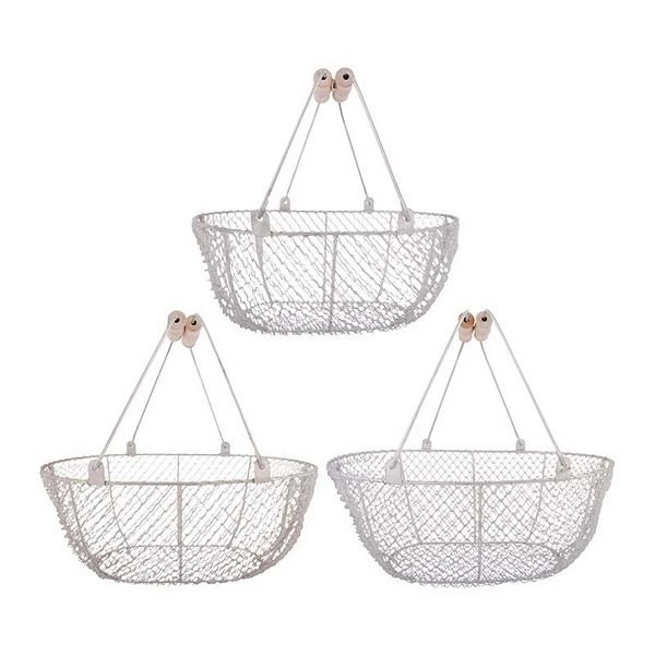 Oogstmand van gegalvaniseerd metaaldraad en houten handgrepen. Set van 3