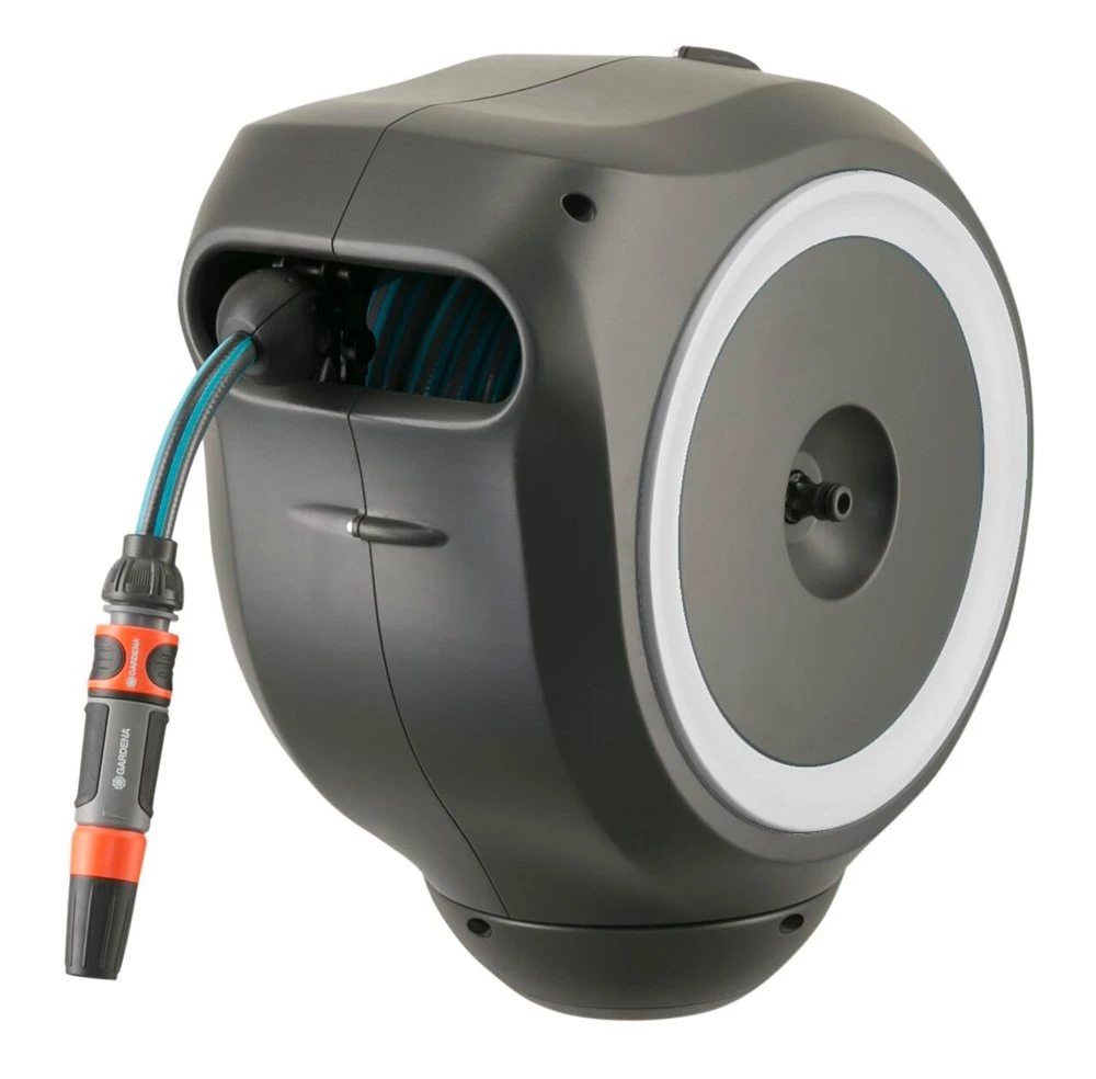 Tuinieren is handiger en gemakkelijker dan ooit met de wandslangenbox RollUp S. Deze helpt uw tuin netjes en opgeruimd te houden en voorkomt hinderlijk struikelgevaar als gevolg van een rondslingerende slang. De praktische slangopslag is eenvoudig aan de muur van uw huis te bevestigen en wordt met een flexibele aansluitslang aangesloten op de kraan. Dankzij de stevige muurbeugel kan de slangenbox meer dan 180 graden worden gedraaid, zodat u elke hoek van uw tuin moeiteloos kunt bereiken. Voor direct gebruik kunt u de tuinslang eenvoudig verlengen tot een lengte van maximaal 15 meter. De tuinslang wordt automatisch in heel korte intervallen vergrendeld zodra u stopt, wat betekent dat de slang eenvoudig en gemakkelijk te hanteren is. Door lichtjes aan het uiteinde van de slang te trekken, wordt de vergrendeling ontgrendeld en een ingebouwde stalen veer met innovatieve RollControl-technologie zorgt voor soepel en gecontroleerd oprollen. De RollControl beschermt de slangenbox en de omgeving tegen schade als gevolg van het te snel inrollen. Om knikken of knopen in de slang te voorkomen, heeft de box een geïntegreerde slanggeleider. Dankzij de slang- en kraanaansluitingen van het Original GARDENA System kunt u eenvoudig en flexibel een verlengstuk of ander compatibel GARDENA element op de slang aansluiten. U hebt altijd uw GARDENA slangopzetstukken bij de hand. Ze kunnen onder de muurbeugel worden bevestigd en daar worden opgeborgen om ruimte te besparen. De GARDENA wandslangenbox is UV- en vorstbestendig en kan het hele jaar door probleemloos aan de muur van het huis blijven bevestigd. Het hoogwaardige materiaal biedt u een lange levensduur en gebruiksgemak zonder onderhoud. Bovendien kan de box niet worden gestolen dankzij de antidiefstalbeveiliging en kan de box alleen door u van de muur worden verwijderd. Samen met de wandslangenbox ontvangt u een muurbeugel, een flexibele aansluitslang, alle benodigde Original GARDENA System en montageonderdelen en een mondstuk met twee verschillende sproeiopties. Dit hoogwaardige product wordt geleverd met een garantie van vijf jaar van GARDENA. Bewatering die altijd gebruiksklaar is , dankzij de GARDENA wandslangenbox RollUp S.