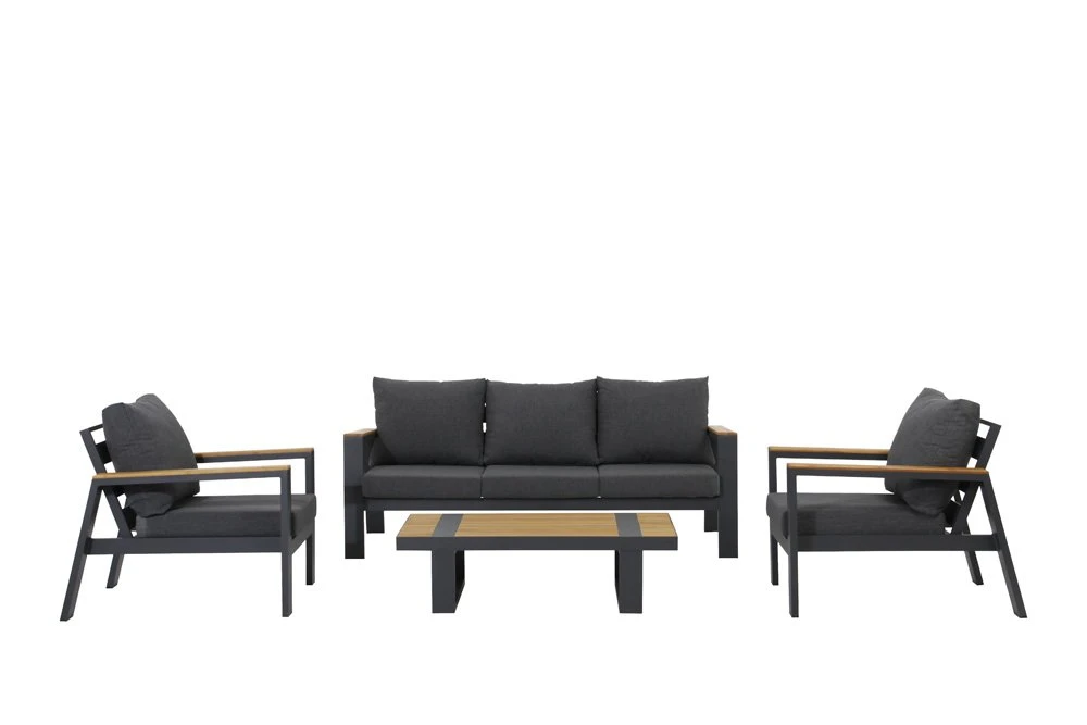Met een tuinset die uit verschillende delen bestaat, kunt u gemakkelijk uw eigen opstelling maken. Zo ook deze Java tuinset van Royal Seasons. De loungeset is 4-delig en bestaat uit een 3-zitsbank, 2 fauteuils en een salontafel. De kleur van de loungset is donkergrijs en bevat houtkleurige elementen. Het tafelblad en de armleuningen zijn gemaakt van teakhout wat bijdraagt aan de luxe uitstraling van deze tuinset. Bij aankoop van deze tuinset krijgt u uiteraarde de kussens erbij.